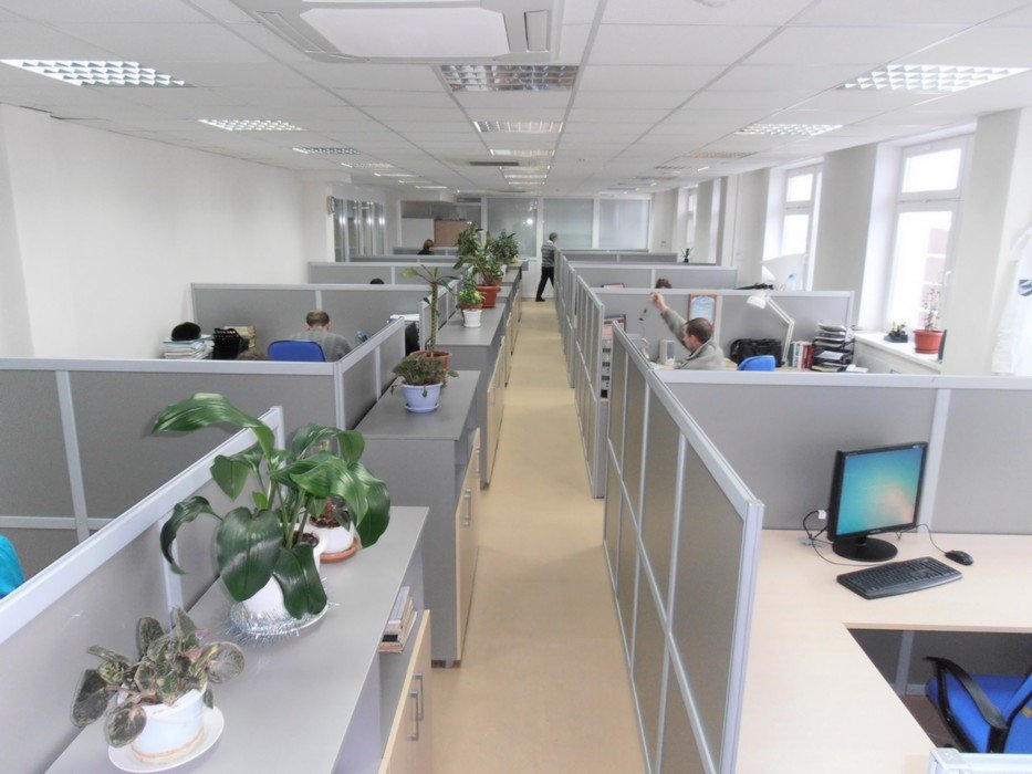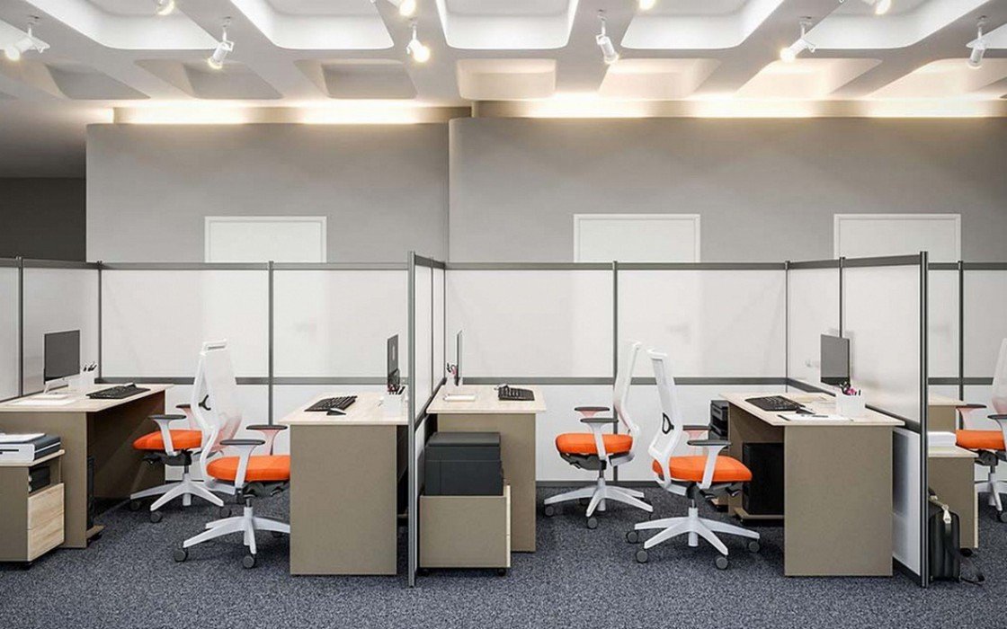 Исходя из ширины помещения, особенностей выполняемых работ и количества сотрудников, можно найти как напольные, так и настольные варианты. Высота напольных варьируется от одного до двух метров. Их нижняя секция изготовляется из крепкого ДСП, а верхняя – из поликарбоната или толстого стекла. При желании изделия обклеиваются матовой плёнкой. Перегородки между столами для зонирования офиса больше подходят для маленьких комнат или для столов, расположенных вплотную друг к другу. Они выполнены из матовых материалов, которые не отсвечивают то, что делается на экране рабочего компьютера, таким образом позволяя глазам меньше напрягаться и не отвлекая на себя внимание. Также эти вариации быстро снимаются при надобности.